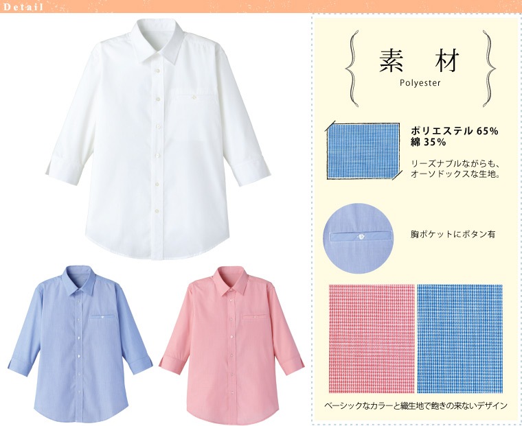 ●上品なホワイトシャツ、袖口スリット入りで動きやすい七分袖、ベーシックなシャツカラーもきちんと感があります。