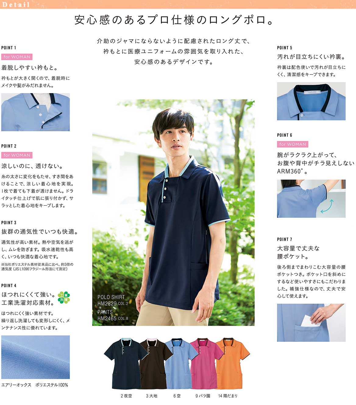 - 衿もとに医療ユニフォームの雰囲気を取り入れた、安心感のあるデザインです。