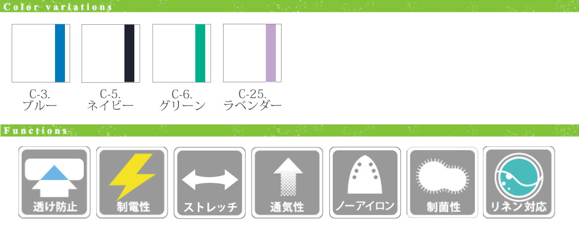 - ■ 機能/透け防止、制電、ストレッチ、制菌、工業用洗濯可、イージーケア