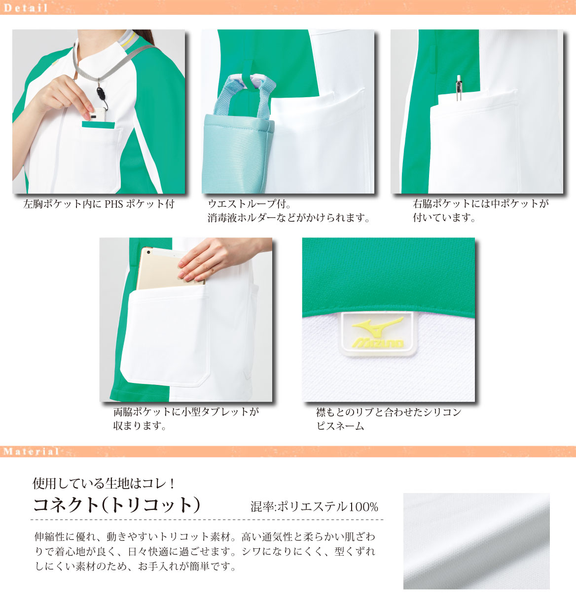 - 伸縮性に優れ、動きやすいトリコット素材。