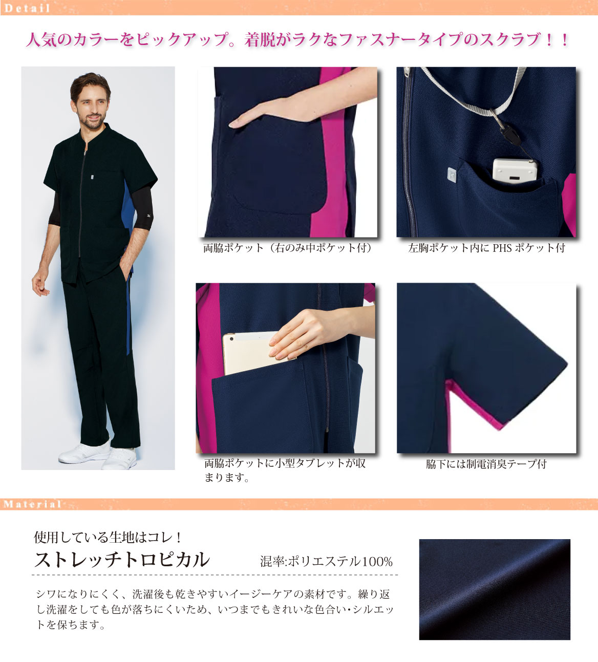 人気のカラーをピックアップ。着脱がラクなファスナータイプのスクラブ!!
