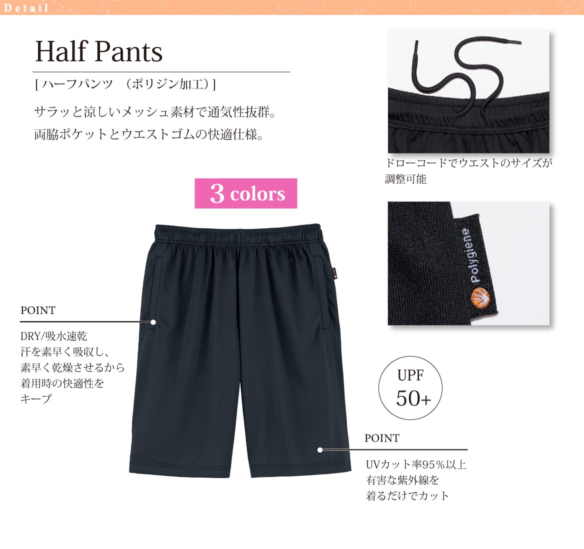 サラッと涼しいメッシュ素材で通気性抜群のポリジン加工のハーフパンツ