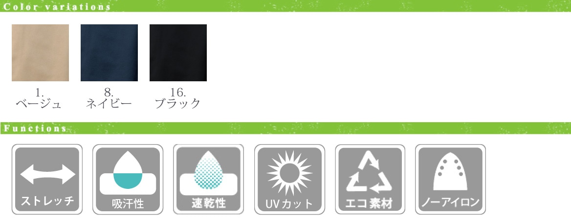 - ■ 機能/ストレッチ、防シワ性、吸水、速乾、UVカット