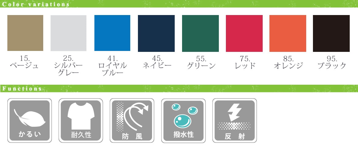 - ■ 仕様/反射機能、軽量、高耐久、撥水、防風性