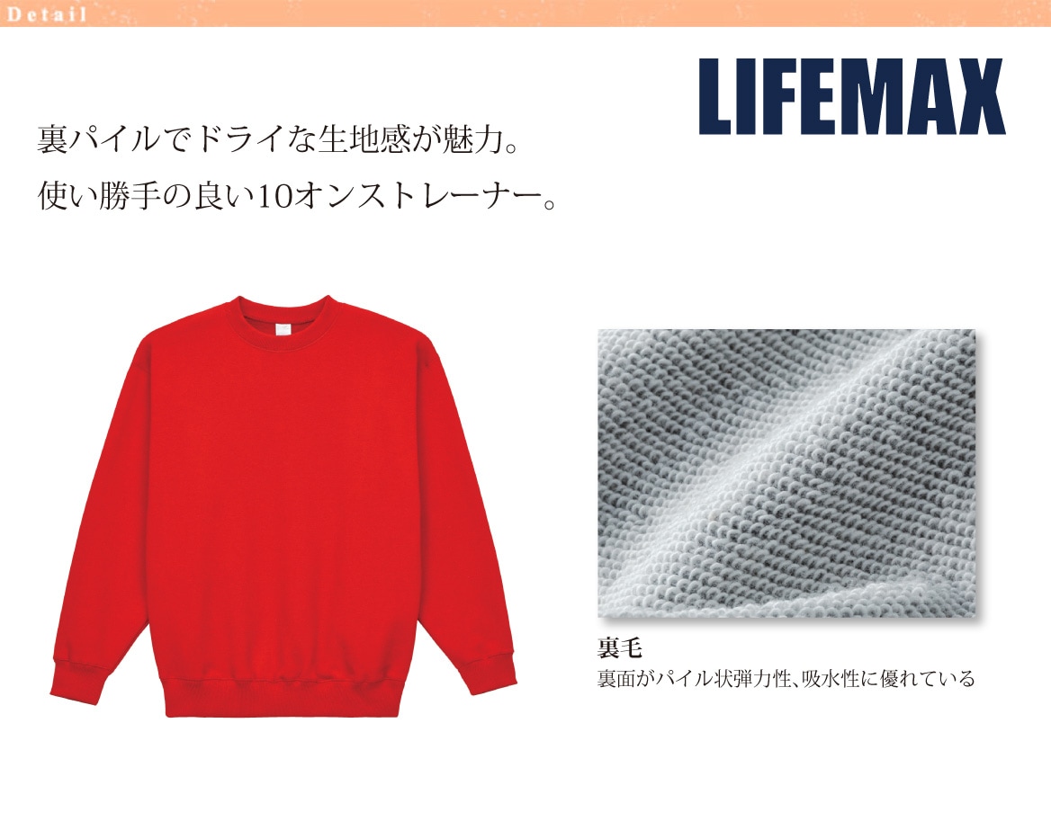 裏パイルでドライな生地感が魅力。使い勝手の良い10オンストレーナー。