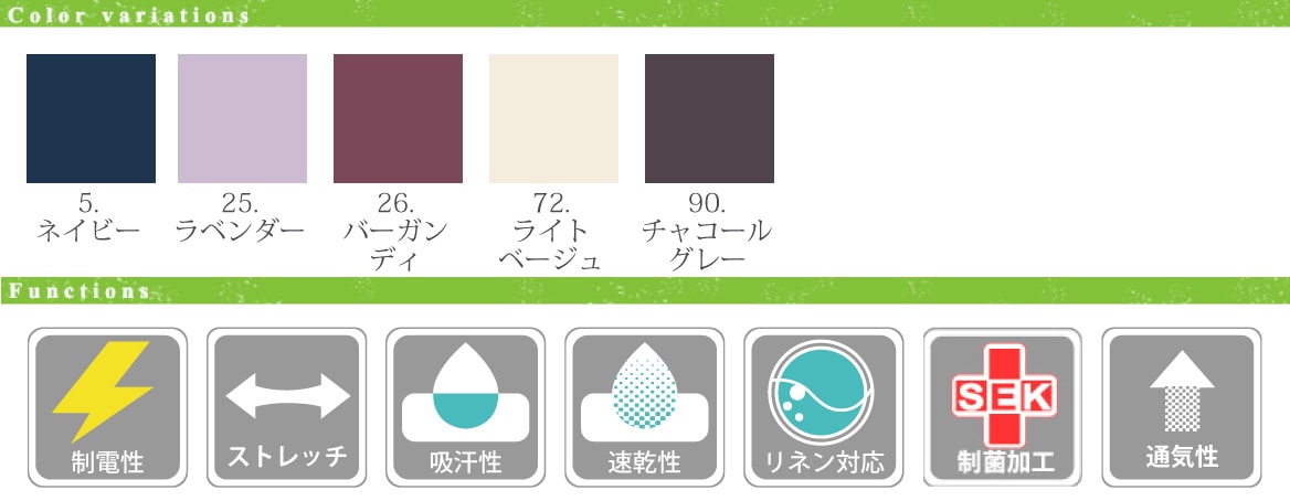- ■ 機能/制電、ストレッチ、吸汗速乾、高通気、工業洗濯対応、制菌加工