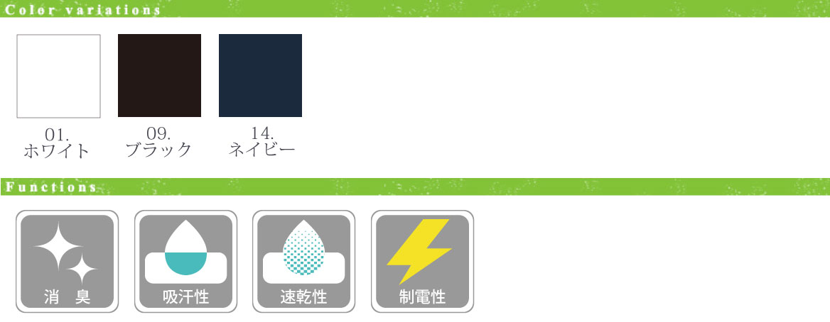 - ■ 機能/制電、吸汗速乾、消臭