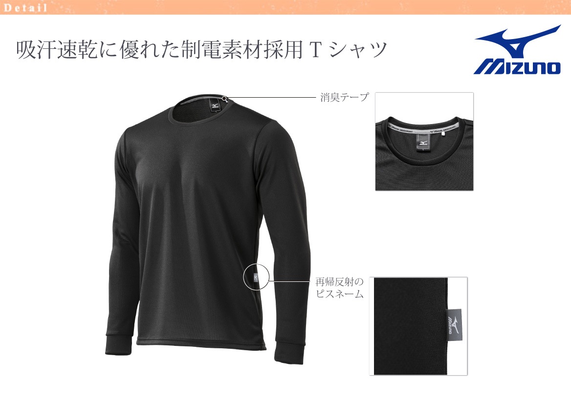 動的機能裁断・機能素材選定など、運動時の動きやすさを追求した吸汗速乾に優れた制電素材採用長袖Tシャツ