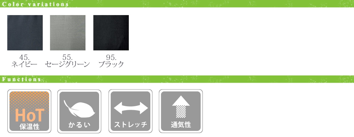 - ■ 仕様/軽量性 保温性 通気性 袖口、裾ストレッチバインダー 縫製糸により静電気もケア