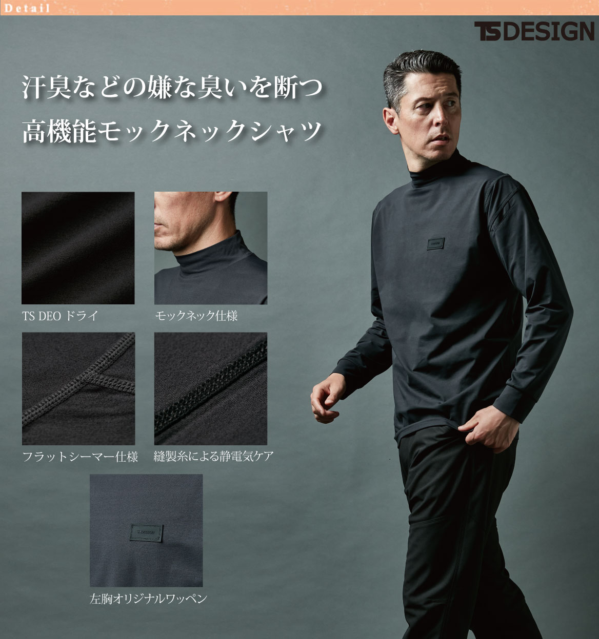 TS DESIGN独自開発の消臭+UVカット素材で、汗臭などの嫌な臭いを断つ高機能モックネックシャツ