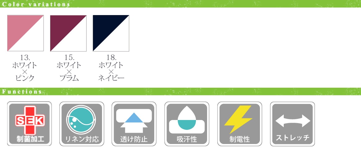 - ■ 制菌・工業用洗濯可・透け防止・吸汗性・制電・ストレッチ