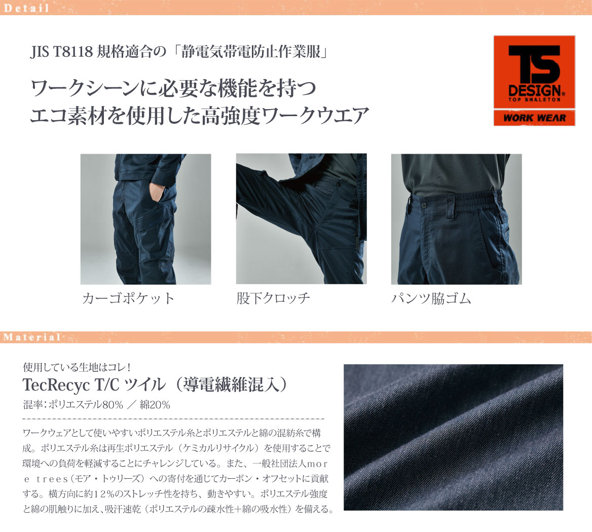 JIS T8118規格適合の「静電気帯電防止作業服」ワークシーンに必要な機能を持つエコ素材を使用した高強度ワークパンツ