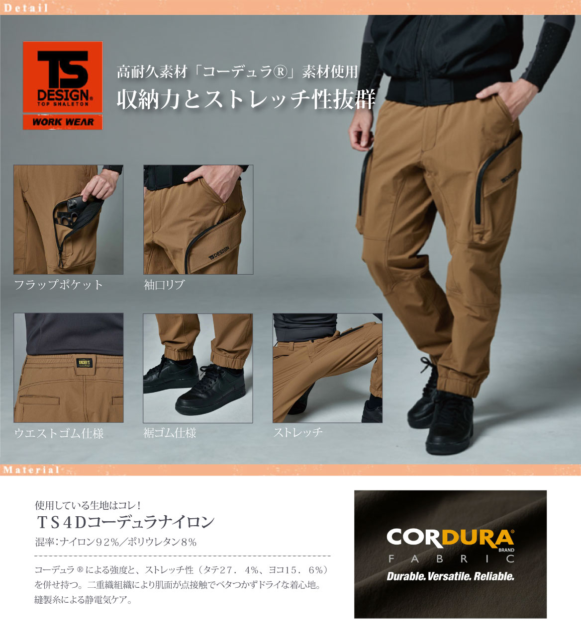 高耐久素材「コーデュラ®」素材使用ストレッチ性も抜群で幅広いフィールドで活躍ストレージパンツ