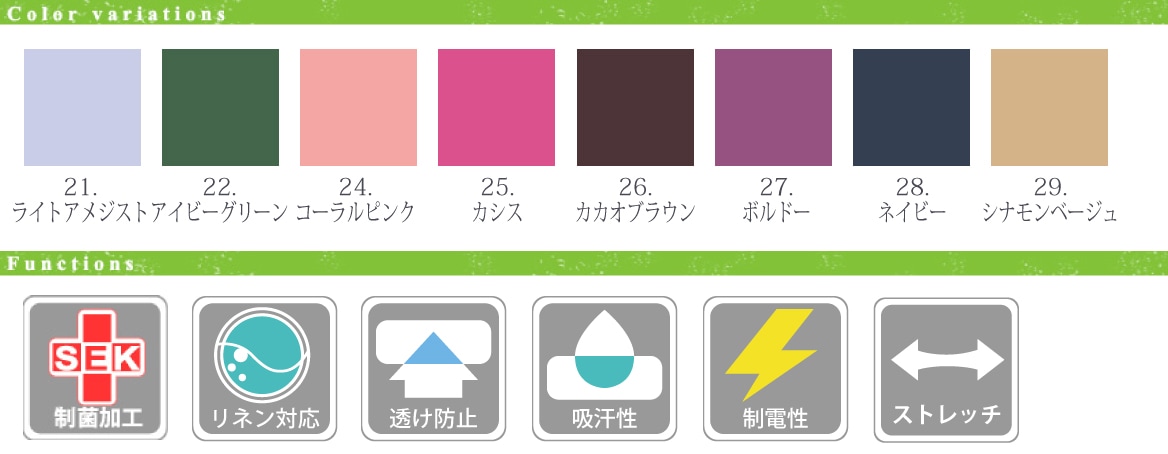 - ■ 制菌・工業用洗濯可・透け防止・吸汗性・制電・ストレッチ