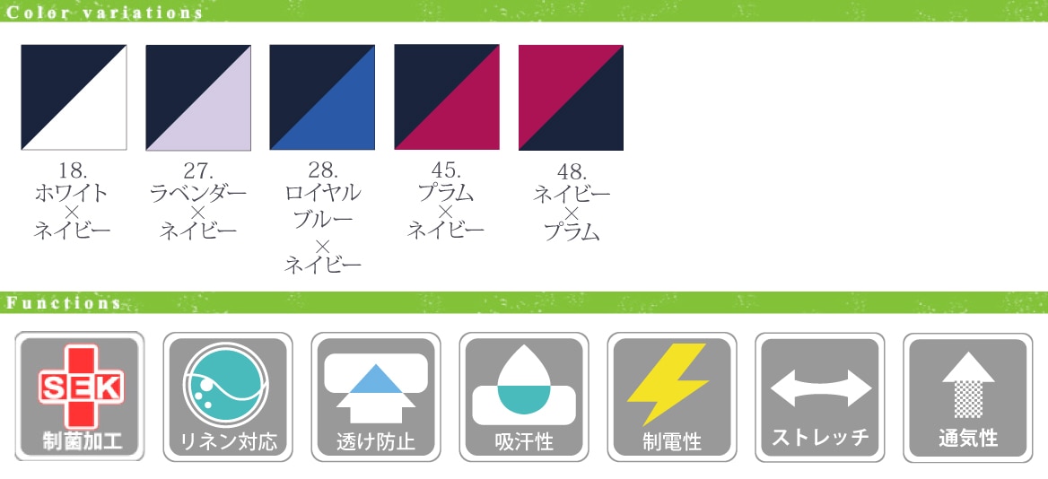 - ■ 制菌・工業用洗濯可・透け防止・吸汗性・制電・ストレッチ・通気性