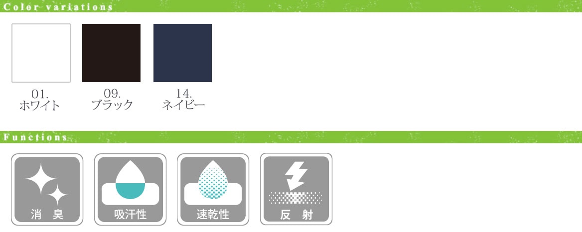 - ■ 機能/吸汗速乾、ドライタッチ、消臭テープ、反射プリント