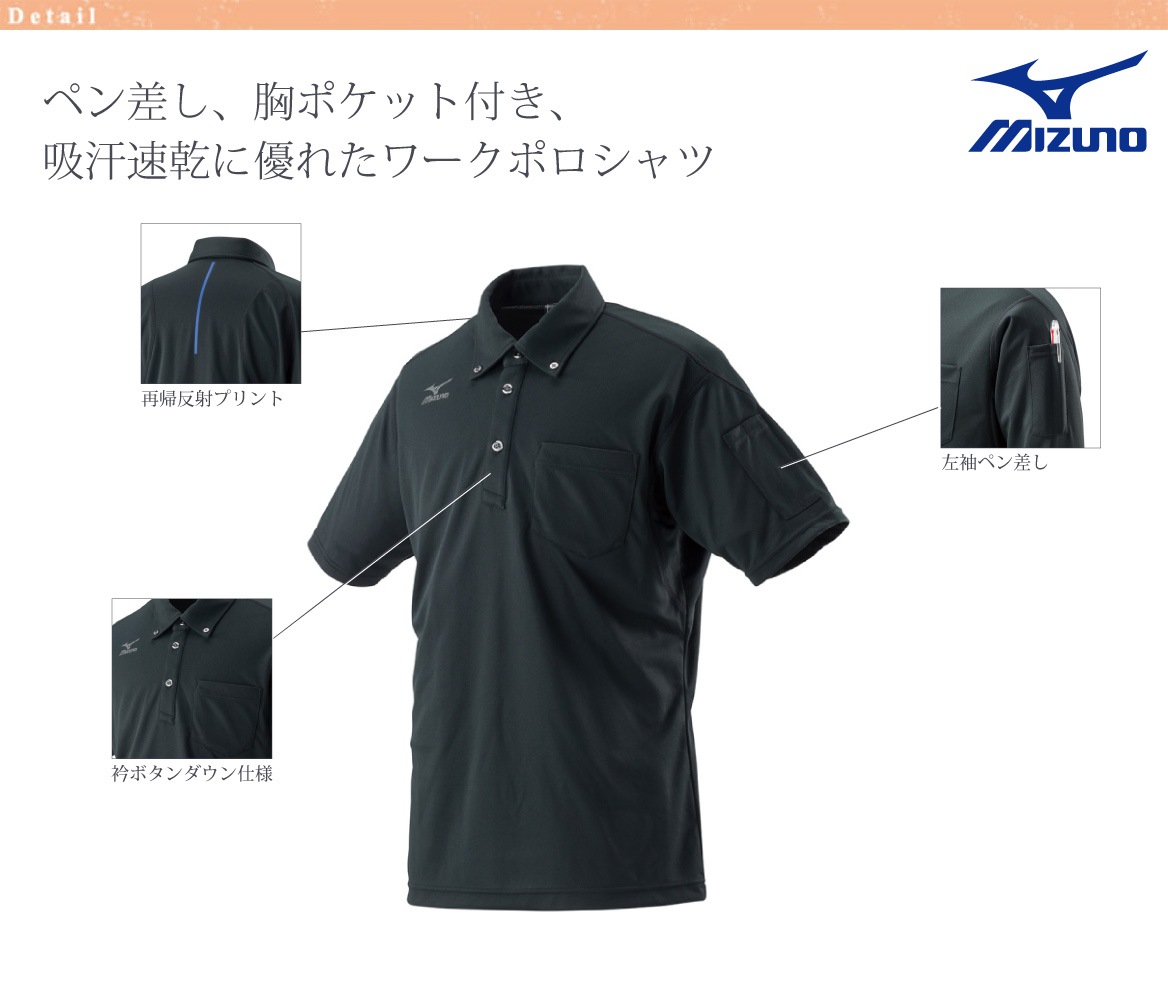 - ■ 仕様/ボタンダウン、左胸ポケット、吸汗速乾素材採用、ミズノデオドラントテープ