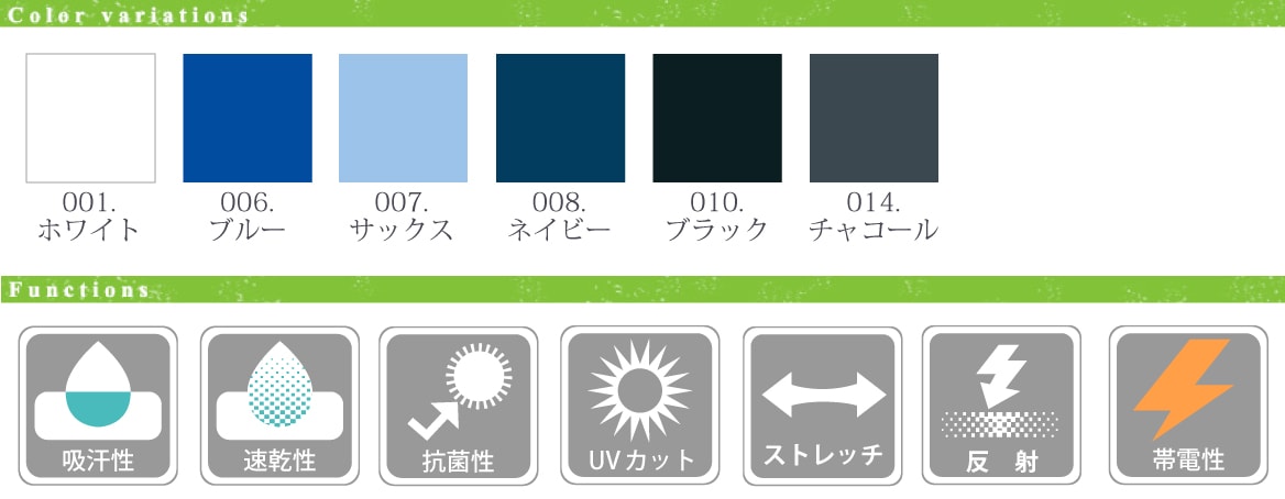 - 帯電防止・ストレッチ・吸汗速乾・UVカット