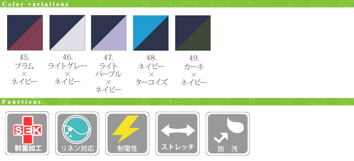 - ■ 制菌・工業用洗濯可・制電・ストレッチ・防汚