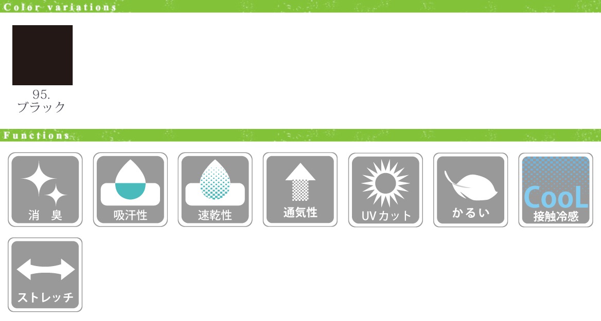 - ■ 消臭機能、吸水速乾、高通気、UVカット、軽量、接触冷感、ストレッチ