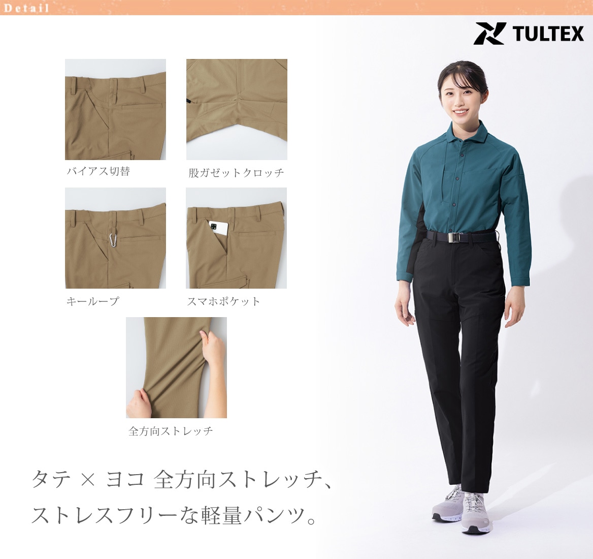 タテ×ヨコ 全方向ストレッチ、軽快でストレスフリーなワークパンツ