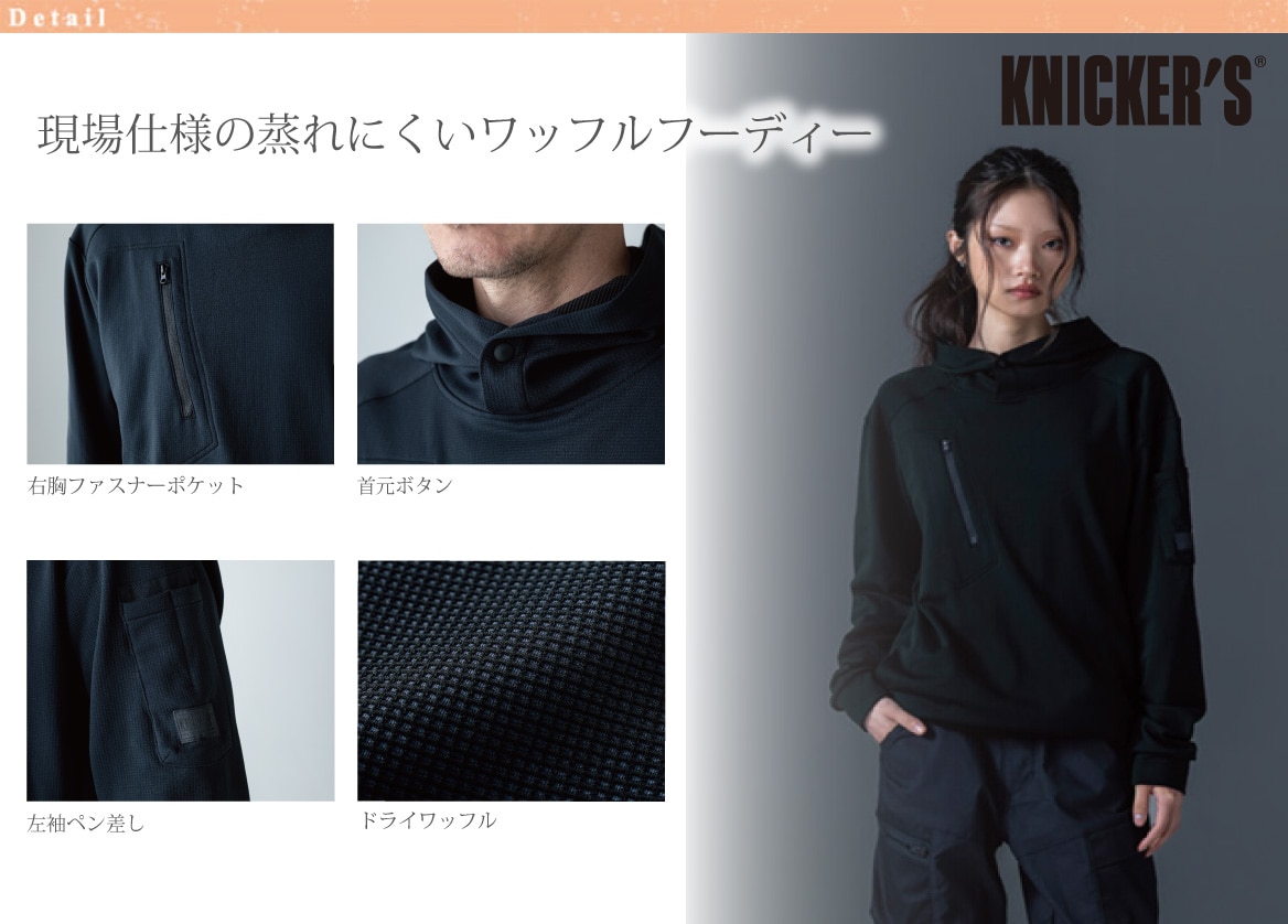 現場仕様の蒸れにくい KNICKER'S ワッフルフーディー。