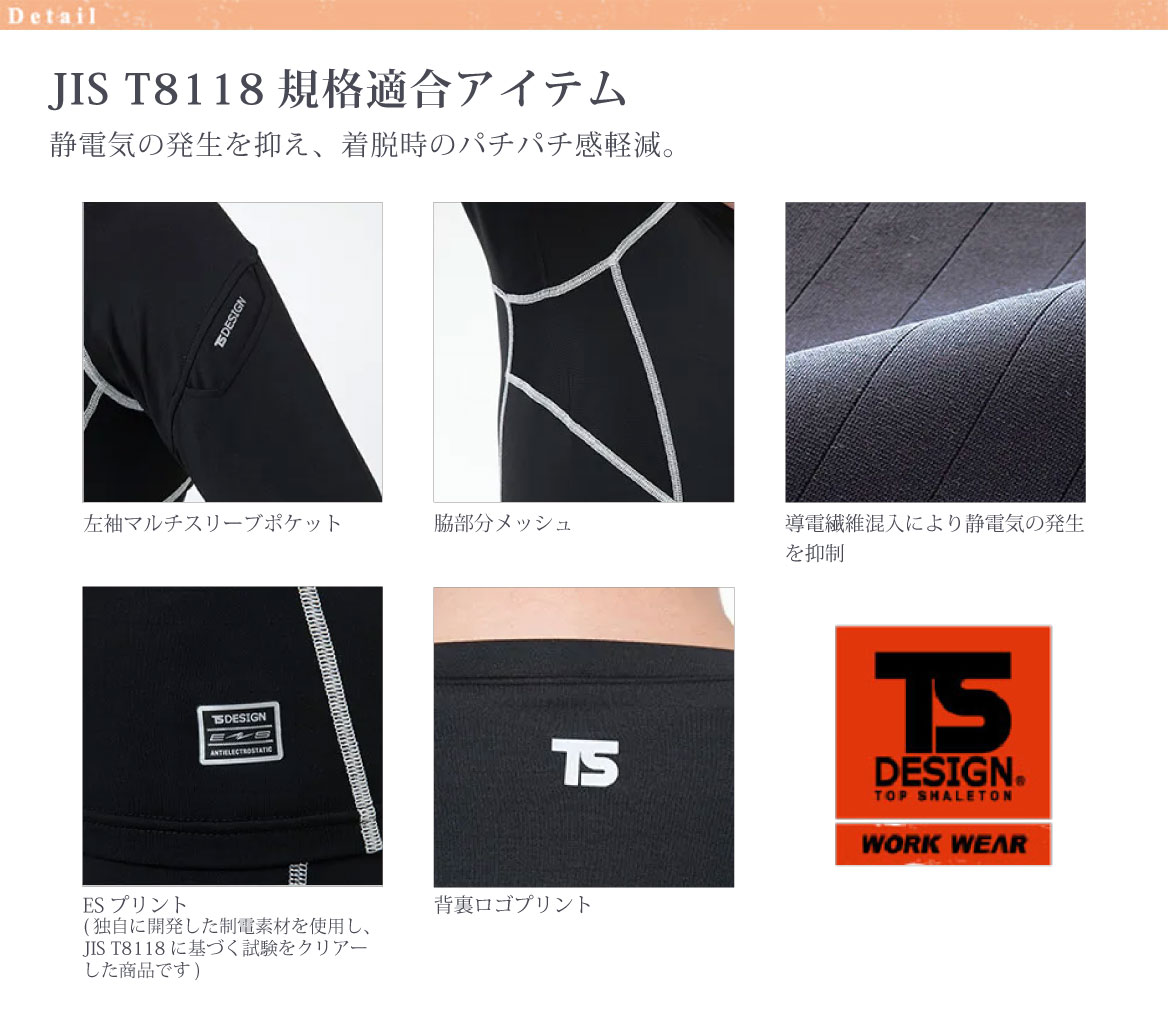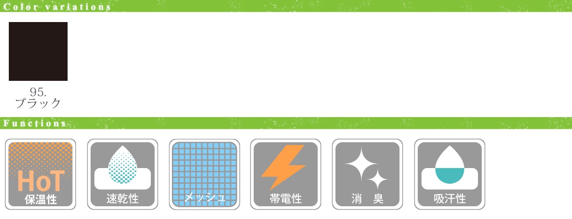 - 保温性、吸汗速乾、帯電防止 JIS T8118、メッシュ仕様、消臭機能
