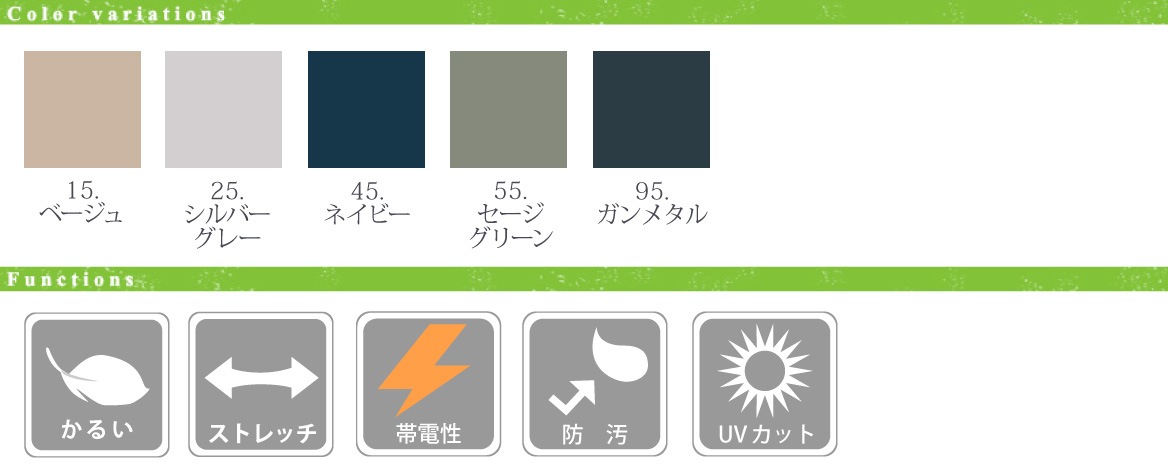 ストレッチ性(ヨコ15%)、SR(防汚)加工、軽量、UVカットの機能もある。