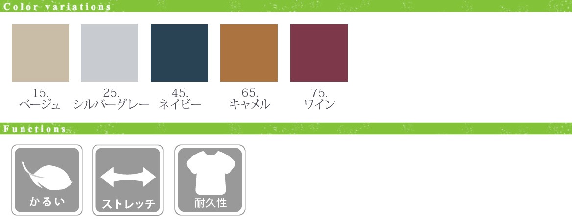 ポリウレタンを使う事なくストレッチ性を持たせている為、劣化によるストレッチ性の低下や膝抜けのリスクを軽減している。