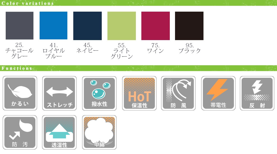 - ■ 仕様/軽量、ストレッチ、撥水、保温性、防風性、帯電防止JIS T8118、反射機能、防汚、透湿性