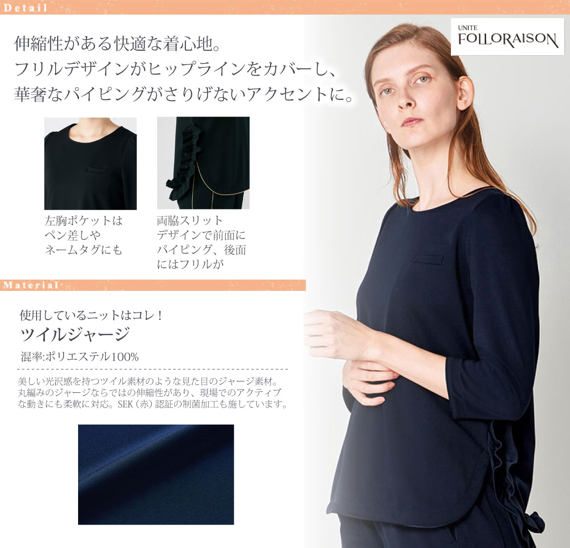 美容クリニックや受付、審美歯科などおもてなし職種向けのデザインが特徴のユニフォームです。