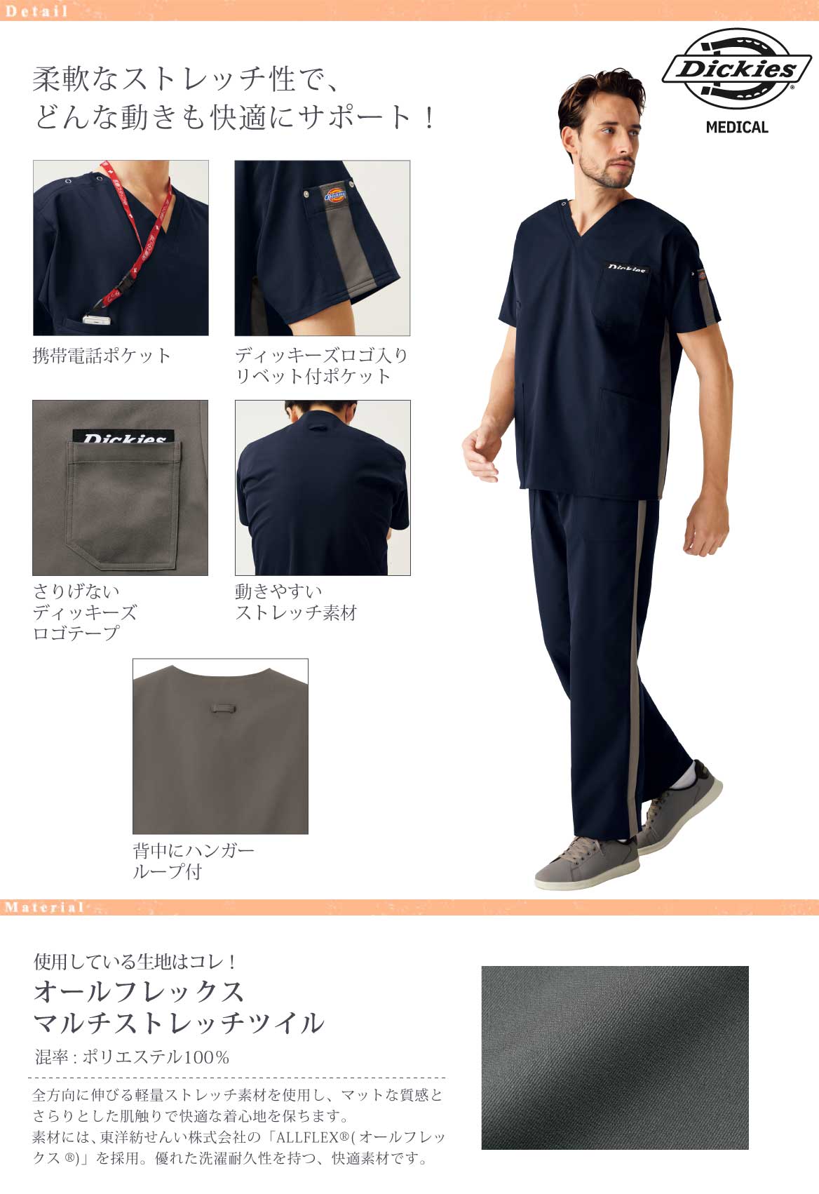 デザイン性と実用性を両立した、ディッキーズならではの多機能スクラブです。