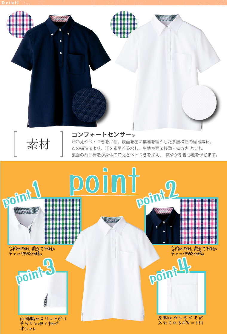衿元や袖、裾のスリットの裏にチェック柄を配えました。チラリと覗く柄がおしゃれなポロシャツです。