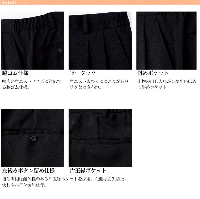 汎用性の高いリーズナブルパンツ! 一枚仕立て、フロントツータック。両脇斜めポケット、ウエスト両脇ゴム仕様。後ろ両脇片玉縁ポケット、左側釦留め。豊富なサイズ展開。