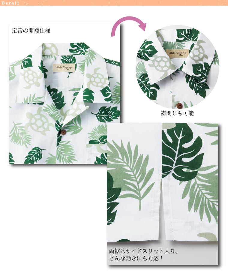 幸運を運んでくれ、海の守り神と言われているウミガメ。そんな縁起の良いウミガメ柄を採用しました。優しい印象を与える明るめのグリーンとブルーの2色展開です。開襟仕様ですが第1ボタンとループで襟を閉じて着用することもできます。
