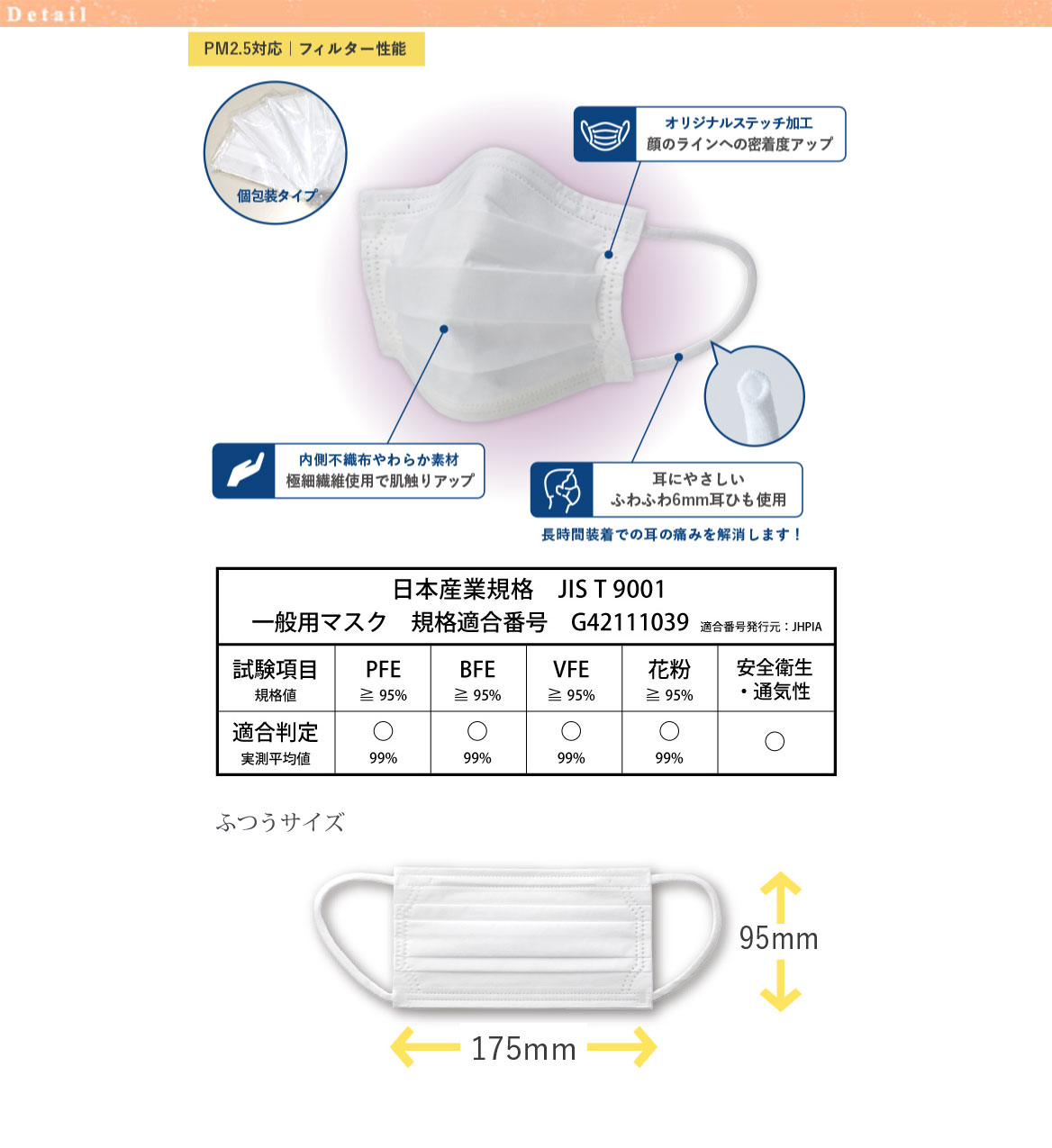 本体・フィルター部 / ポリプロピレン不織布 耳ひも / ポリエステル、ポリウレタン ノーズフィッター部 / ワイヤー、ポリエチレン