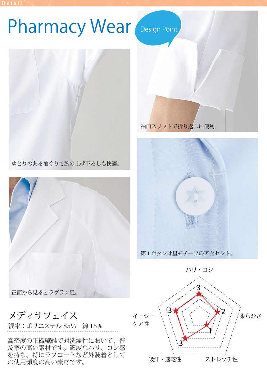 接客から棚卸し等の大きな動きまで、あらゆる作業を考慮した機能性抜群の薬局衣。