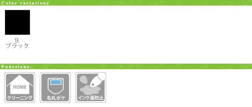 インク漏れ防止対応になっているポケットや、名札ポケット、ホームクリーニングOKと嬉しい仕様。