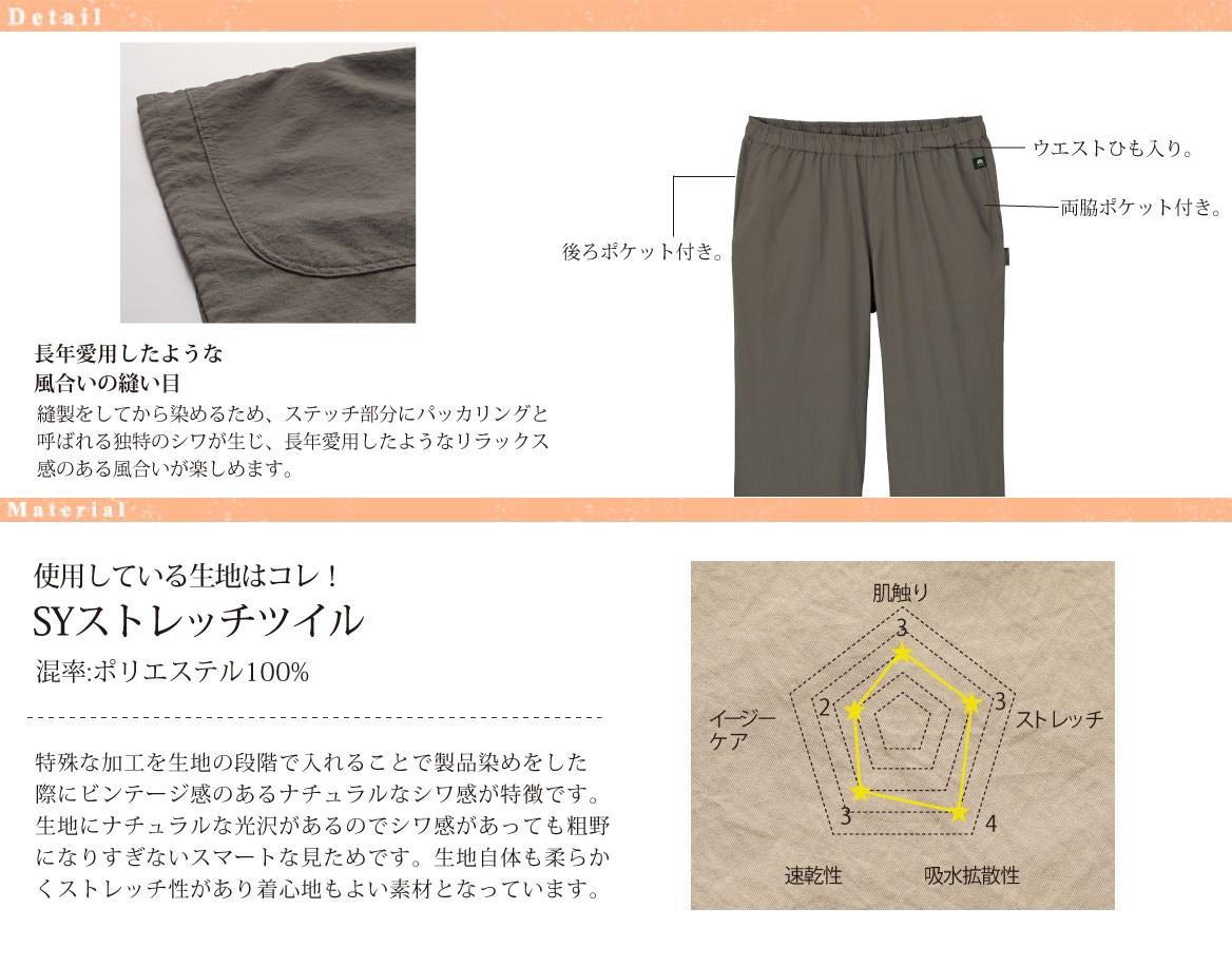 - ◎総ゴム/両脇ポケット/後右ポケット/ウエストひも入り