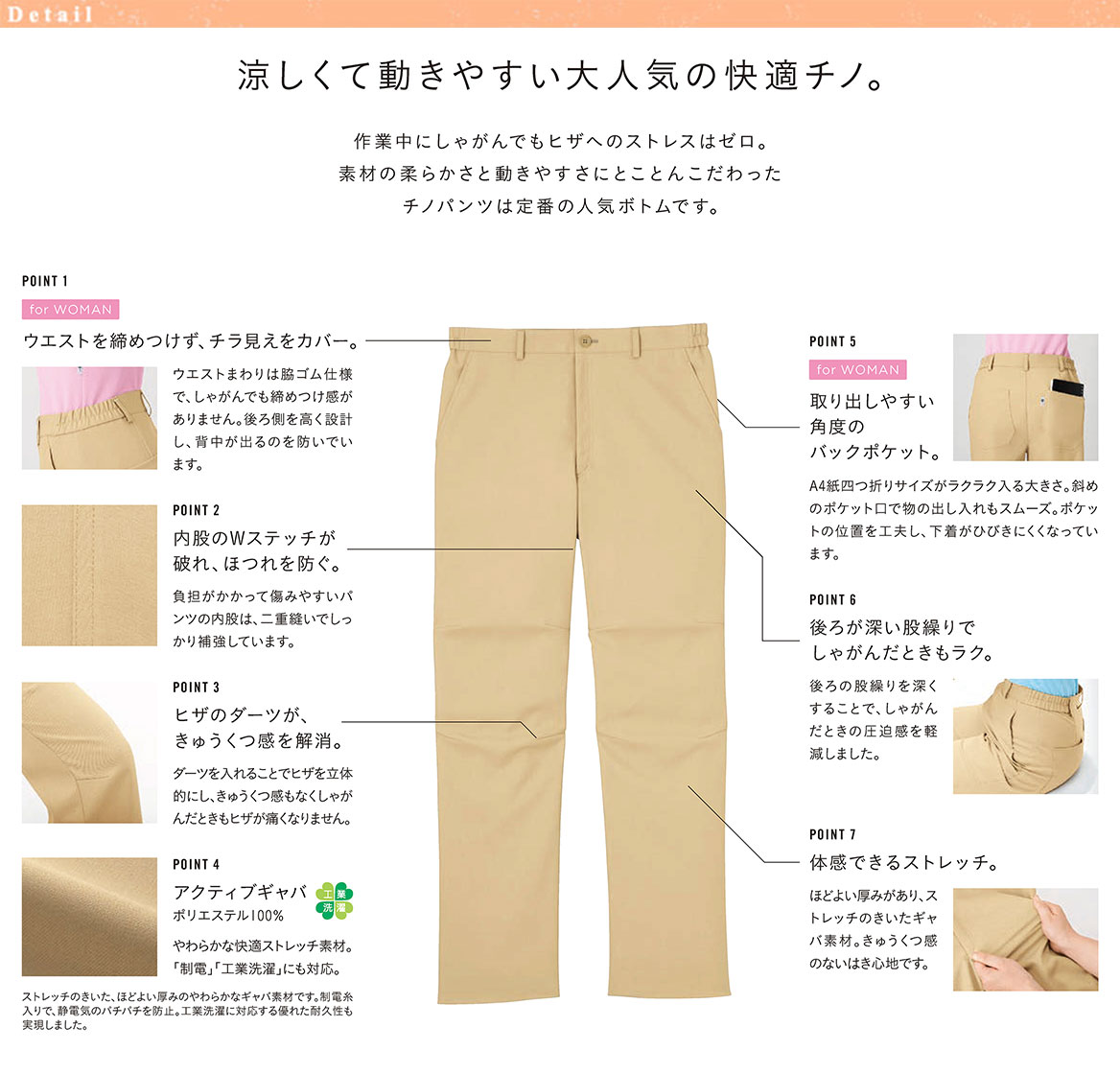 介護スタッフにオススメ!涼しくて動きやすい大人気の快適レディス用チノパンツ。