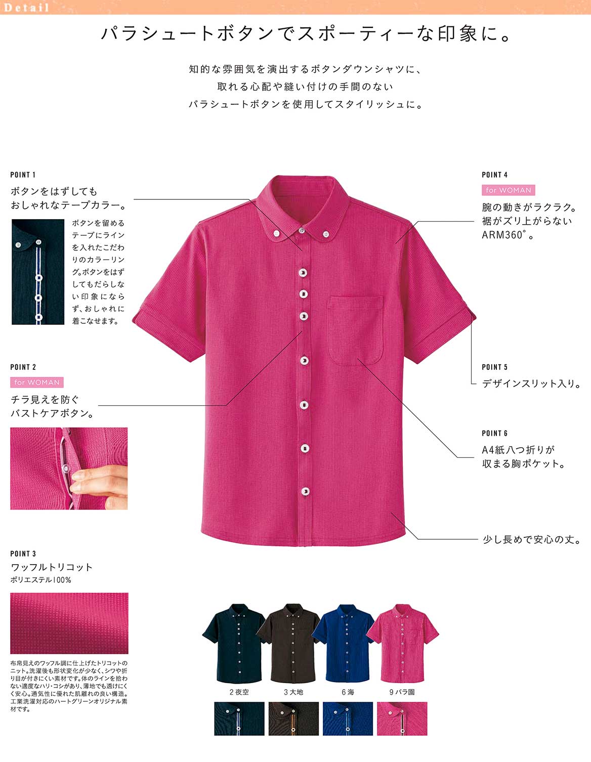 - 知的な雰囲気を演出するボタンダウンシャツに、取れる心配や縫い付けの手間のないパラシュートボタンを使用してスタイリッシュに。