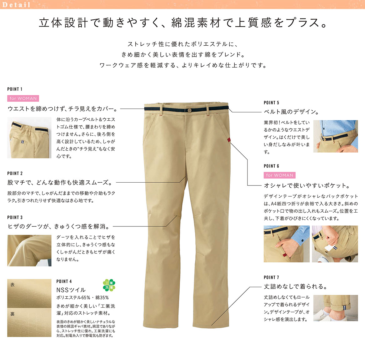 介護スタッフにオススメ!立体設計で動きやすく、綿混素材で上質感をプラスした男女共用パンツ。