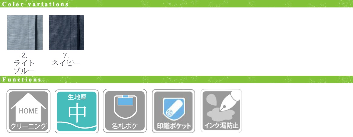 おうち洗濯、生地厚み中、胸ポケット、名札ポケット、印鑑ポケット、胸のポケットのインク染み出し防止生地使用、インク漏れ防止、肩パッドなし