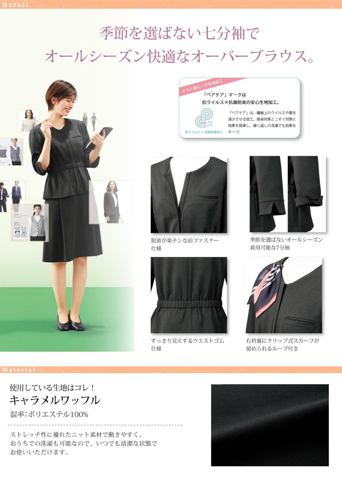 右衿裏のリボンループにスカーフを付けることで、華やかな印象になり、幅広い職種の方に対応。