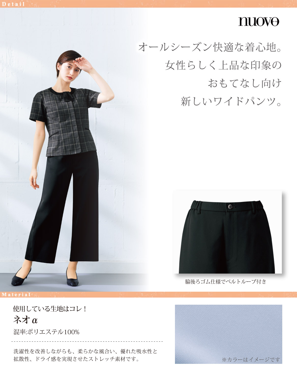 オールシーズン快適な着心地。女性らしく上品な印象のおもてなし向け新しいワイドパンツ。