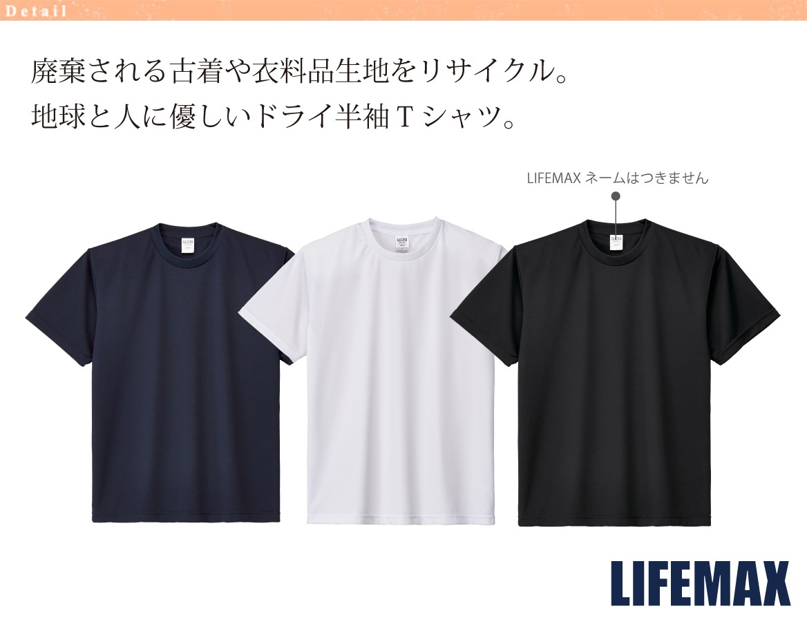 廃棄される古着や衣料品生地をリサイクル。地球と人に優しいライフマックスドライ半袖Tシャツ。