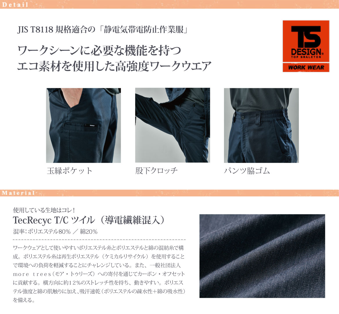 JIS T8118規格適合の「静電気帯電防止作業服」ワークシーンに必要な機能を持つエコ素材を使用した高強度ワークパンツ