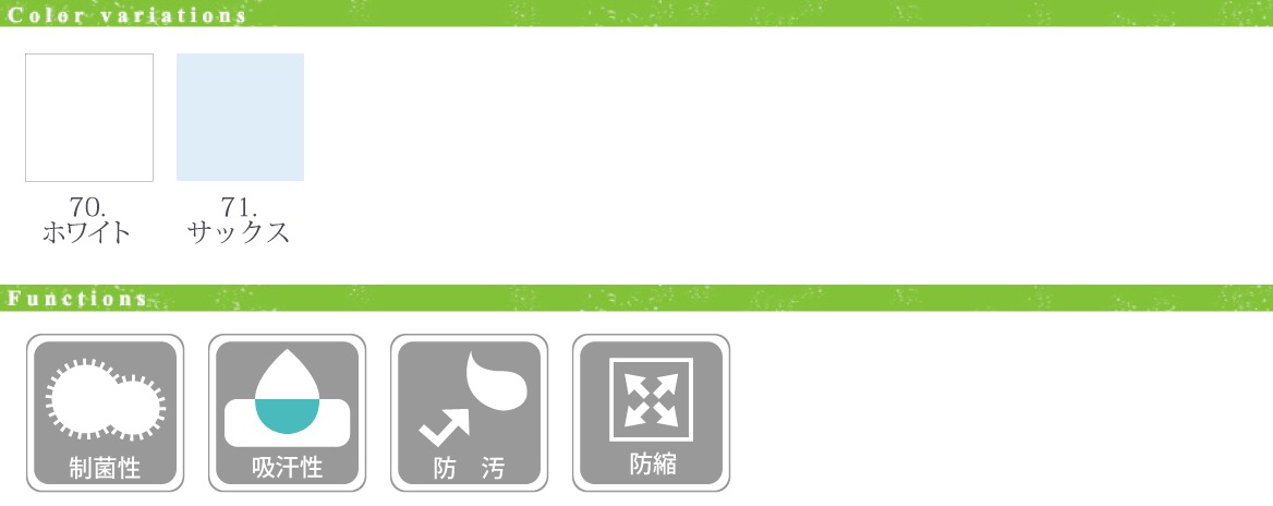- ■ 制菌加工、吸汗性、防汚、防縮加工、シルケット加工・樹脂加工
