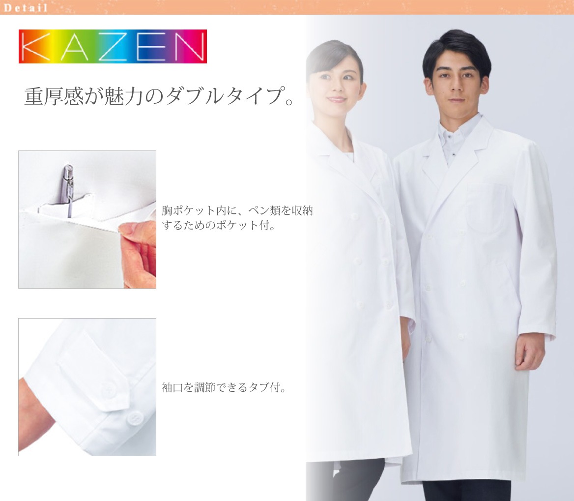 重厚感が魅力のダブルタイプのメンズ診察衣。袖口を調節できるタブ付で活動しやすいデザイン。