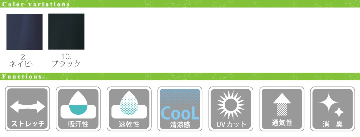 - ■ 仕様/ニット、2wayストレッチ、吸汗速乾、吸放湿、接触冷感、高通気、UVカット